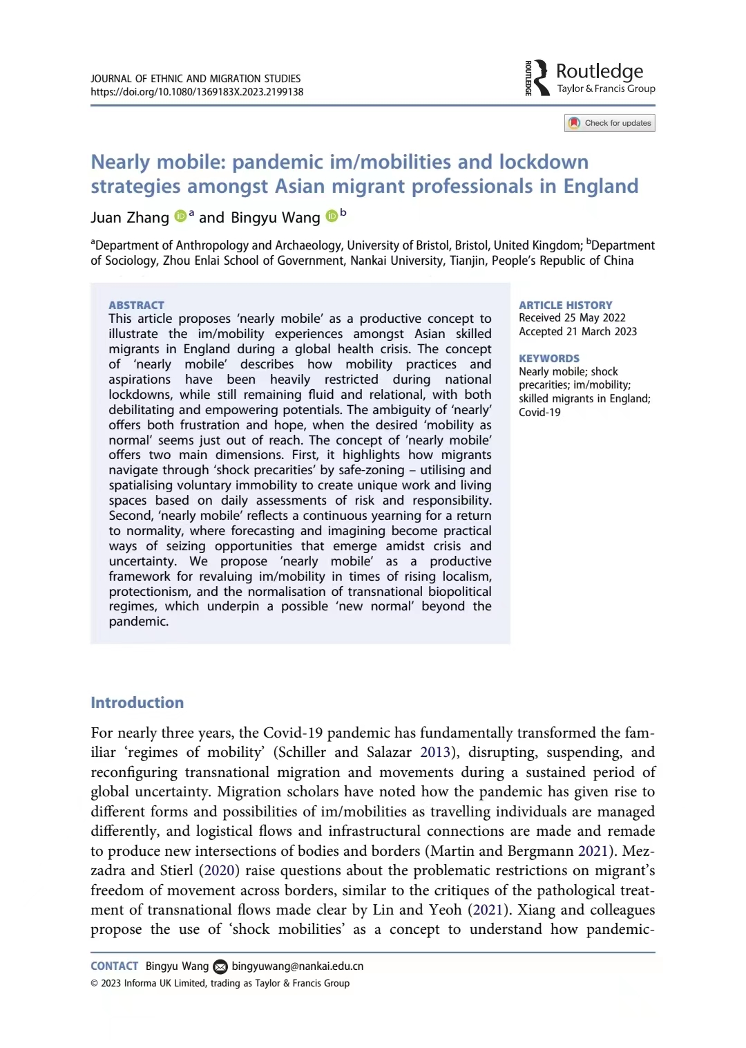 近期,伟德victor1946周恩来政府管理学院社学系王炳钰教授(作为通讯作者)与布里斯托大学人类学与考古学系张娟副教授的最新合作文章于2023年4月12日在线发表于移民和族群研究顶刊Journal of Ethnic and Migration Studies (JEMS),文章题为Nearly mobile: pandemic im/mobilities and lockdown strategies amongst Asian migrant professionals in England。所发表期刊JEMS为英文核心期刊(SSCI)一区刊物(Journal Citation Reports-Q1);作为移民研究国际权威刊物,JEMS在JCR“族群研究”与“人口学”两个类别均排名世界第1,在谷歌学术“移民研究”和“社会学”两个类别的世界排名分别为第1和第2。本期推文将对这篇文章的研究问题、研究发现以及主要贡献进行介绍。