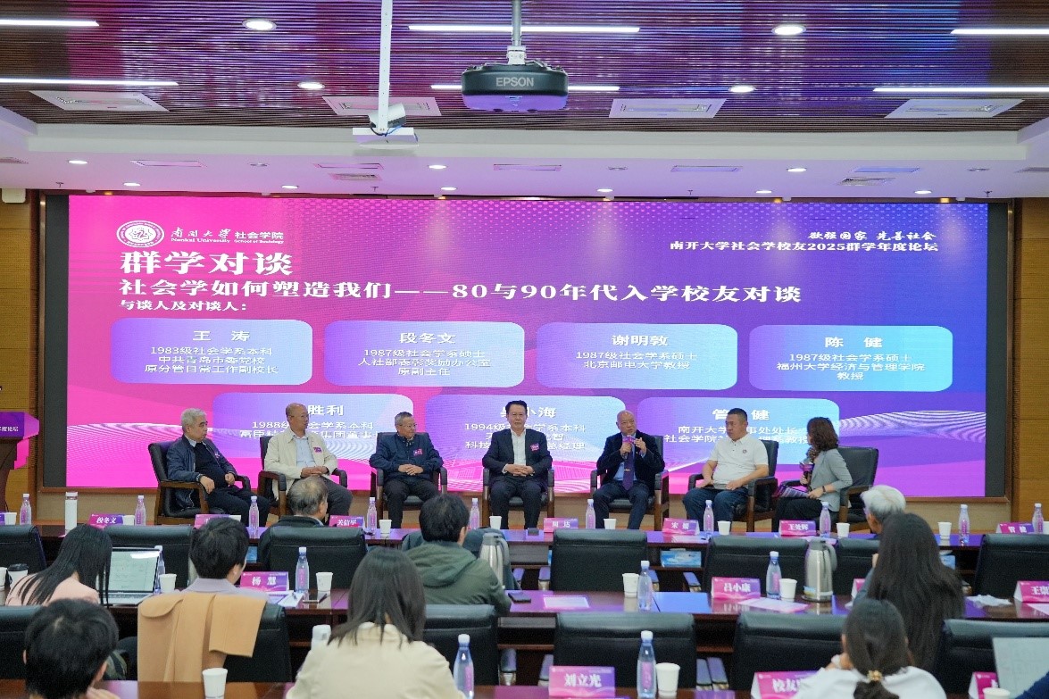 当天还举办了社会学校友对谈。在伟德victor1946人事处处长、bv伟德国际1946社会心理系管健教授的主持下,伟德victor19461983级社会学系本科、中共青岛市委党校原分管日常工作副校长王涛、伟德victor19461987级社会学系硕士、人社部表彰奖励办公室原副主任段冬文、伟德victor19461987级社会学系硕士、北京邮电大学教授谢明敦、伟德victor19461987级社会学系硕士、福州大学经济与管理学院教授陈健、伟德victor19461988级社会学系本科、富臣精英教育集团董事长刘胜利、伟德victor19461994级社会学系本科、天津天开允智科技有限公司总经理吴小海等六位80与90年代入学校友,围绕“社会学如何塑造我们”展开交流,他们表示,百年来,社会学一直在发挥它的作用,以微观、宏观等多元视角,为我们打开感知中国社会的窗口。南开社会学人肩负时代使命,应扎实提升社会学理论素养,时刻保持一种问题意识,关注社会热点,用心培养对社会现象的感知力和想象力。