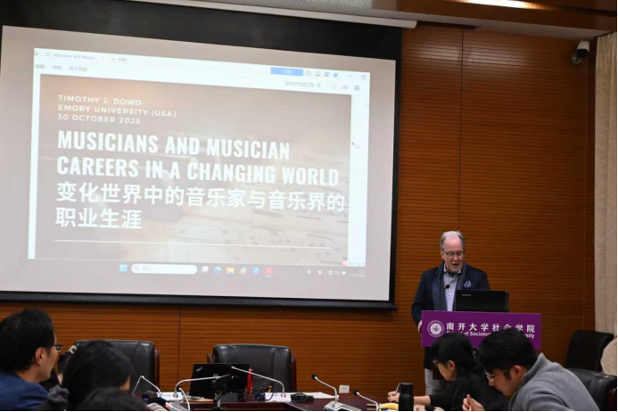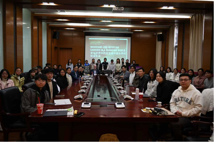 第三项活动是由Dowd教授主讲,题目为“变化世界中的音乐家与音乐界的职业生涯(Musicians and Music Careers in a Changing World)”的讲座,于10月30日中午12:10-13:50在bv伟德国际1946144会议室举行。讲座由bv伟德国际1946社会学系系主任王庆明教授主持。王琰教授、秘舒副教授、张龙副教授、于佳煖讲师、陈柙兵助理研究员、许又姜宇博士等师生出席。