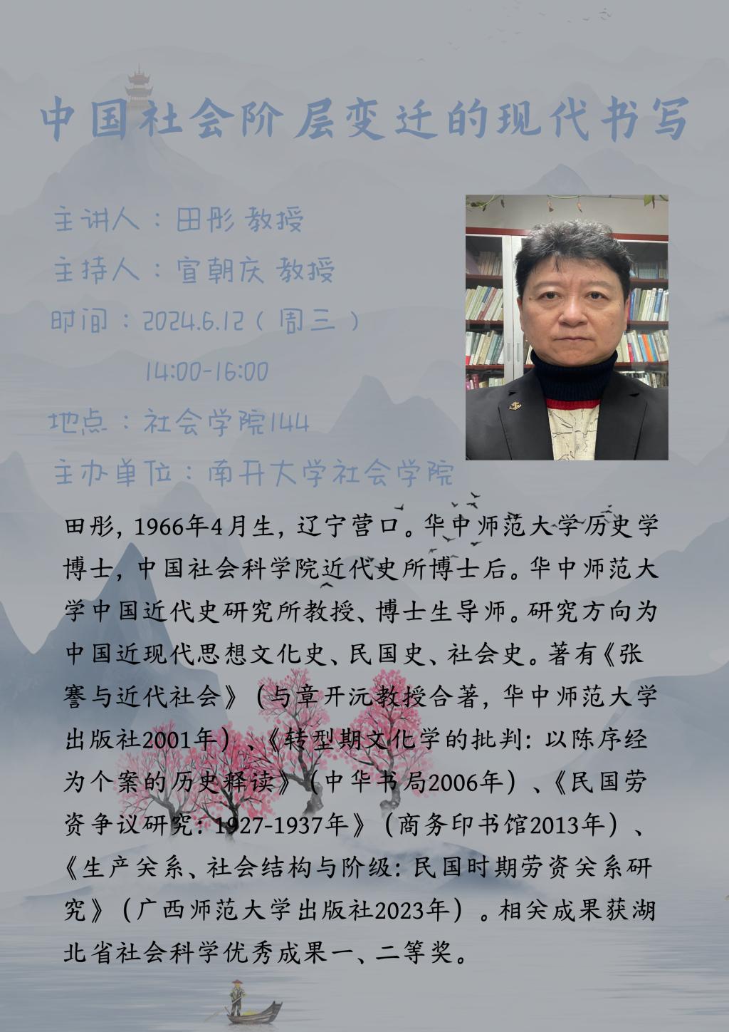田彤,1966年4月生,辽宁营口。华中师范大学历史学博士,中国社会科学院近代史所博士后。华中师范大学中国近代史研究所教授、博士生导师。研究方向为中国近现代思想文化史、民国史、社会史。著有《张謇与近代社会》(与章开沅教授合著,华中师范大学《转型期文化学的批判:以陈序经出版社2001年)中华书局2006年)、《民国劳为个案的历史释读》资争议研究:1927-1937年》(商务印书馆2013年)《生产关系、社会结构与阶级:民国时期劳资关系研究》(广西师范大学出版社2023年)。相关成果获湖北省社会科学优秀成果一、二等奖