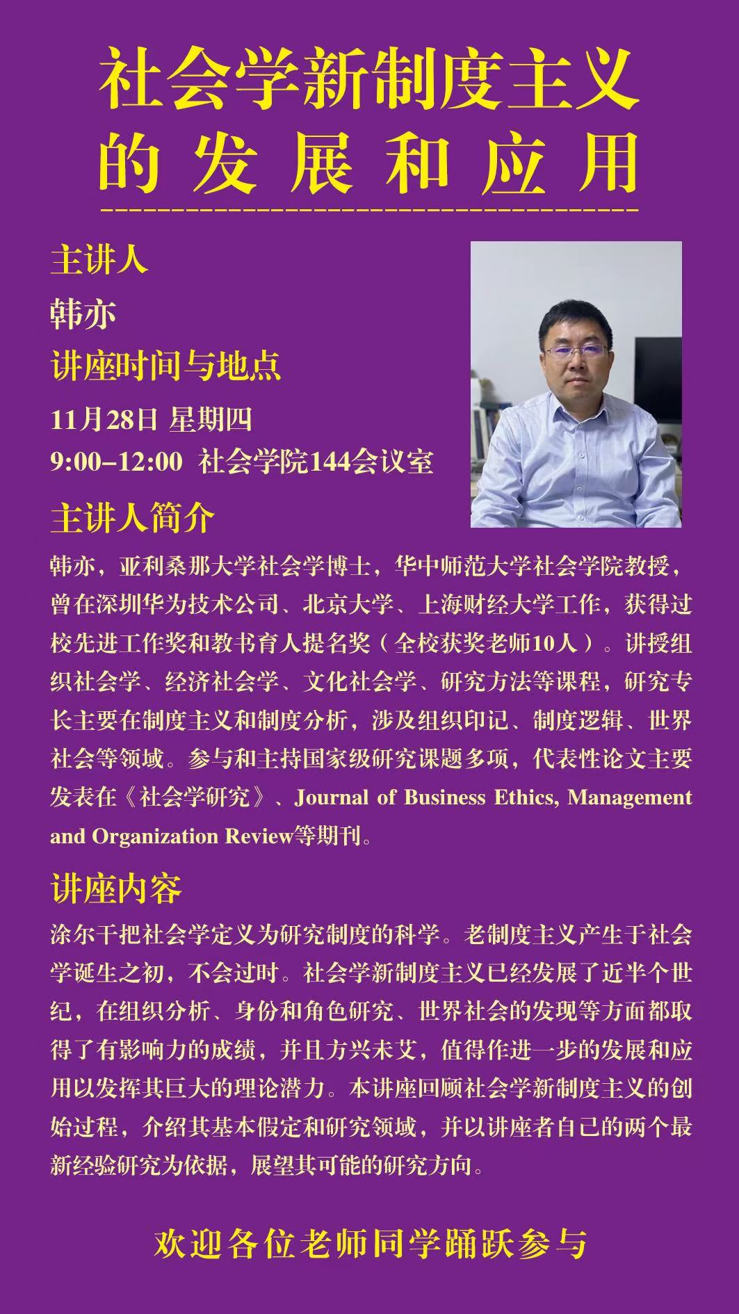 韩亦,亚利桑那大学社会学博士,华中师范大学bv伟德国际1946教授,曾在深圳华为技术公司、北京大学、上海财经大学工作,获得过校先进工作奖和教书育人提名奖(全校获奖老师10人)。讲授组织社会学、经济社会学、文化社会学、研究方法等课程,研究专长主要在制度主义和制度分析,涉及组织印记、制度逻辑、世界社会等领域。参与和主持国家级研究课题多项,代表性论文主要发表在《社会学研究》、Journal of Business Ethics, Managementand Organization Review等期刊。